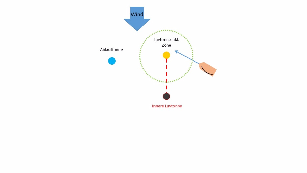 Diese liegt etwa 5-6 Bootslängen in Lee der Luvbahnmarke und somit außerhalb der Zone. Die Boote die von der linken Seite des Kurses auf Steuerbord Bug an die Luvtonne kommen müssen diese Marke in Lee passieren und dürfen die gedachte Linie (rot gestrichelt) zwischen der Luvbahnmarke und der inneren Marke nicht überqueren. Diese innere Marke verhindert das knappe Unterwenden an der Luvtonne da Boote nicht mehr eng auf Steuerbord an die Marke kommen. Somit verhindert man die damit oft verbundenen engen Situationen und Kontakte bis hin zu Bootsknäulen die sich kaum auflösen lassen. Boote die in Lee an der inneren Marke vorbei sind haben noch einige Meter zu segeln und damit genug Möglichkeit sich eine Stelle zur Wende zu suchen um dann die Luvtonne zu passieren.
