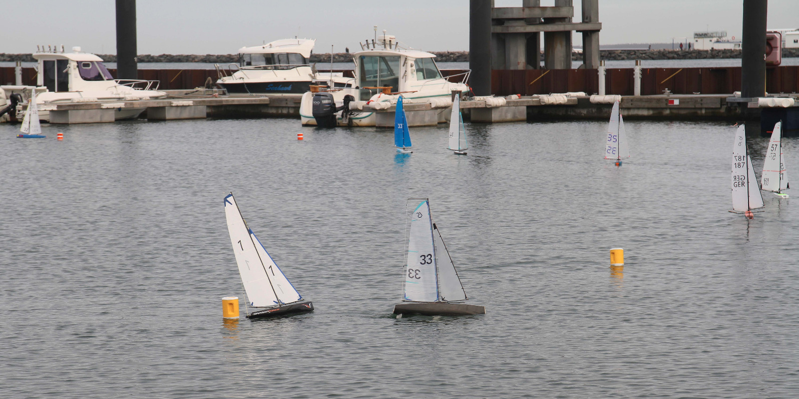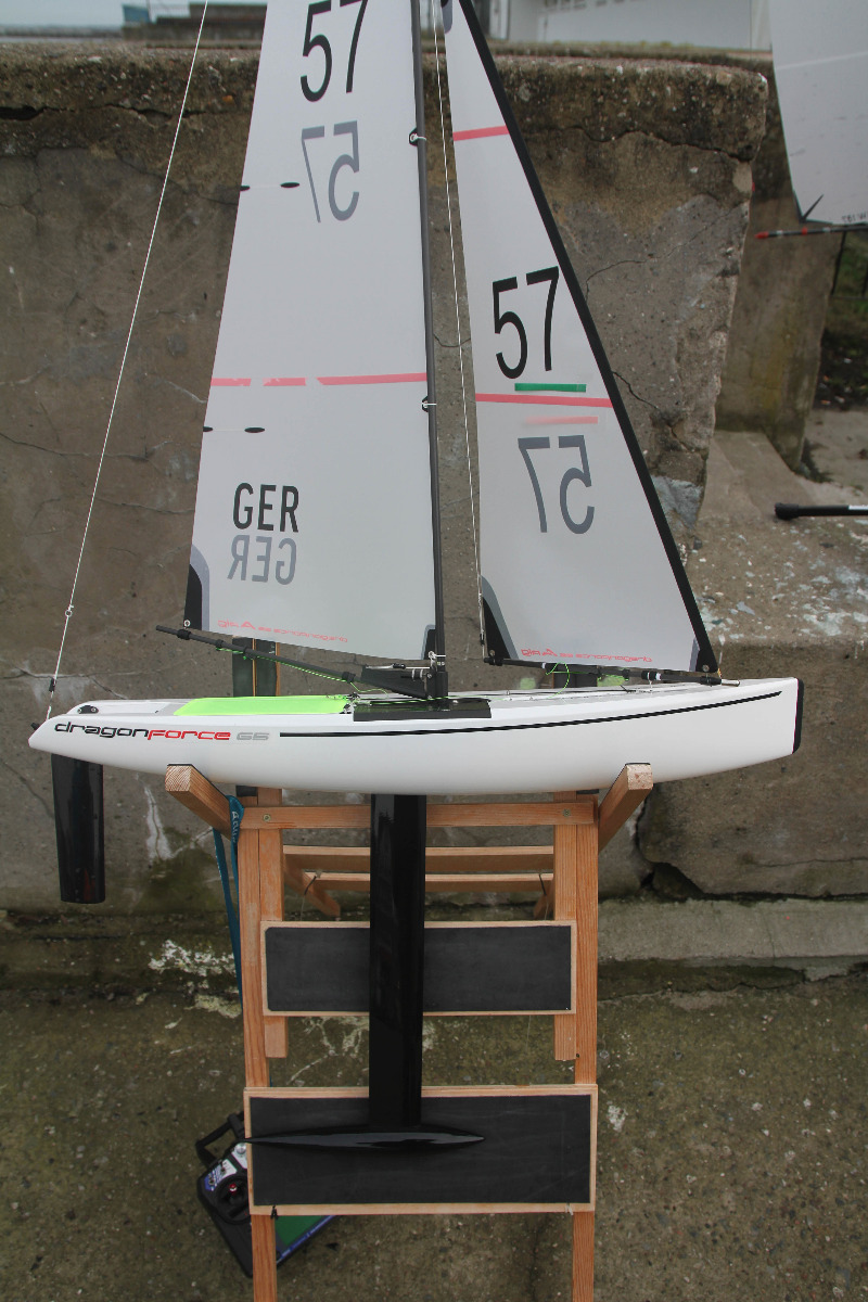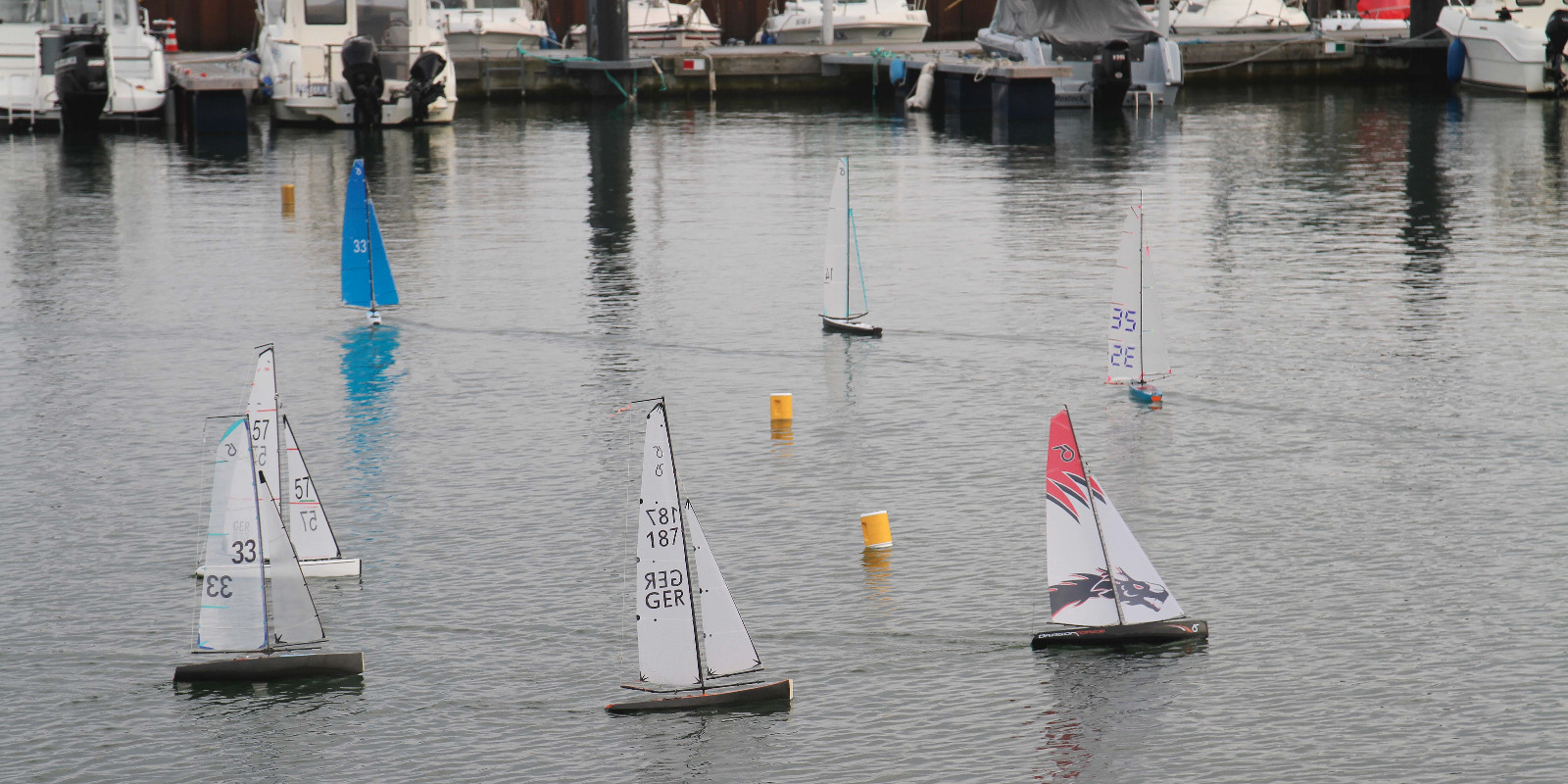 So trafen Sonntag früh 10 Segler und eine Seglerin mit ihren Booten der kleinsten Regattaklasse mit 65 cm Rumpflänge im Yachthafen ein. Darunter acht „highend Custommades“ und drei Boote der preiswerten Einheitsklasse „DragonForce65“. Das Wetter meinte es gut mit uns „trocken, heiter bis wolkig“ jedoch vermissten wir die gemeldeten 9-17 kn. Im etwas geschützten Yachthafen waren wir zumindest von ordentlich Dampf im Leichtwind-Rigg mit Wind zwischen 5-10 kn bei Südwestwind ausgegangen. Anfangs herrschten etwa 1-3 kn. Der Kurs war pünktlich gelegt und alle segelten sich ein (Luvmarke mit Ablauftonne, Leegate mit Start in der Mitte des Kurses, das Ziel wurde von der Luvboje und Ablauftonne aufgespannt, 2 Runden). Jedoch wurde 10:45 Uhr kurz vor Start nochmal die Startlinie angepasst und 11 Uhr gestartet. Der erste Start lief etwas chaotisch, so dass wir nur eine Runde ohne Wertung zur „Aufwärmung“ segelten.