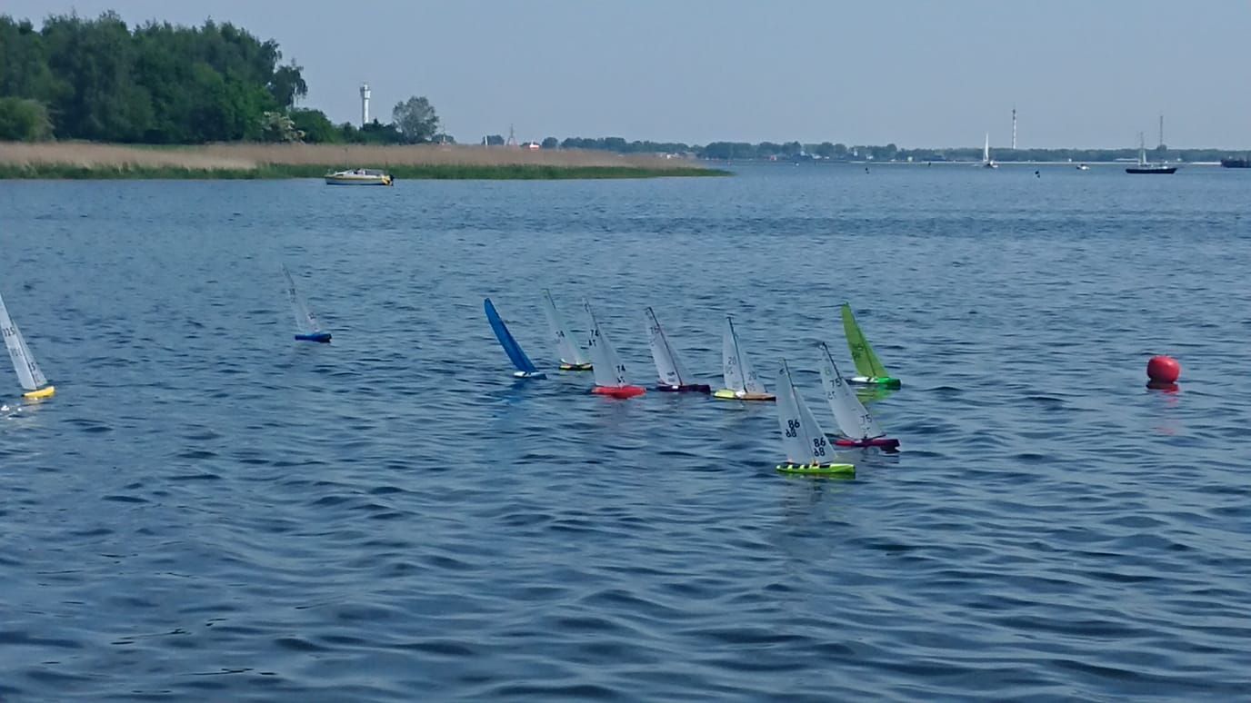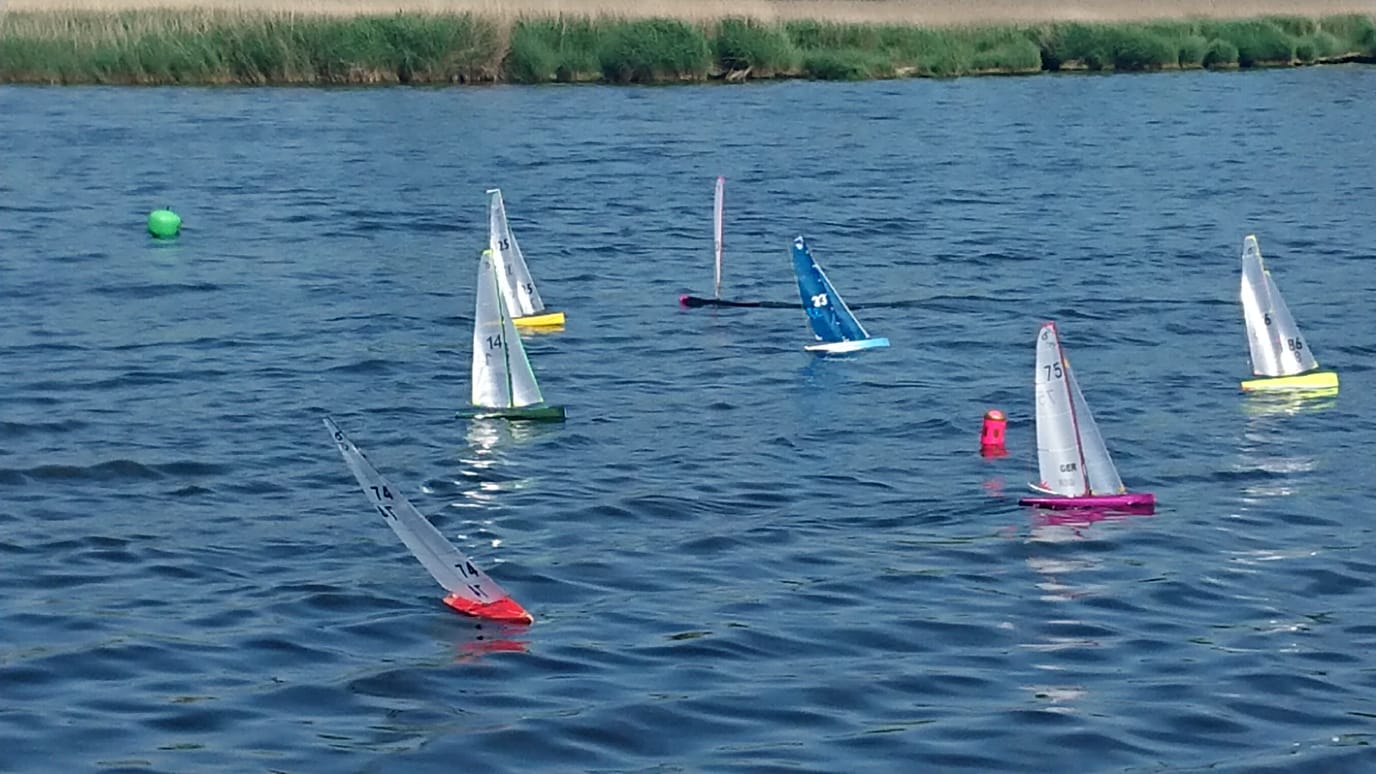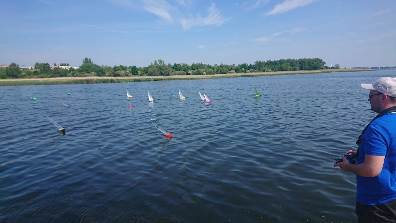Samstag früh hatten sich 11 Segler auf den Weg gemacht. Neu dabei war Lutz aus Berlin. Gegen Mittag kam auch noch Arne’s jüngerer Bruder Christian hinzu, der ebenfalls mit dem Segel-Gen bestückt ist (Laufsieg in Rennen 14). Bei Sonne pur und endlich sommerlichen Temperaturen, Ostwind mit 5-12 kn sowie etwas Welle segelten wir 16 Rennen. Die Bedingungen waren etwas technischer zu fahren als Flachwasser-heizen im Hafenbecken. Sieben von zwölf Fahrern konnten Laufsiege verbuchen, sechs gingen an Patrick, vier an Torsten (GER-340). Sensationell und erwähnenswert fuhr Youngster Piet in Rennen zwei allen davon, musste jedoch die letzten Rennen mit technischem Defekt aussteigen. Defekte und Kollisionen hatten wir allerlei, aber des neue Mehrzweck RC Boot, designt zum Tonnenlegen und für Notrettungen, verrichtete brav seinen Dienst. Torsten (GER-75) wäre mit Sicherheit auch an der Spitze mitgesegelt, aber sein Akku in der Funke ging leider im dritten Lauf kaputt und er fungierte anschließend als Regattaleiter.