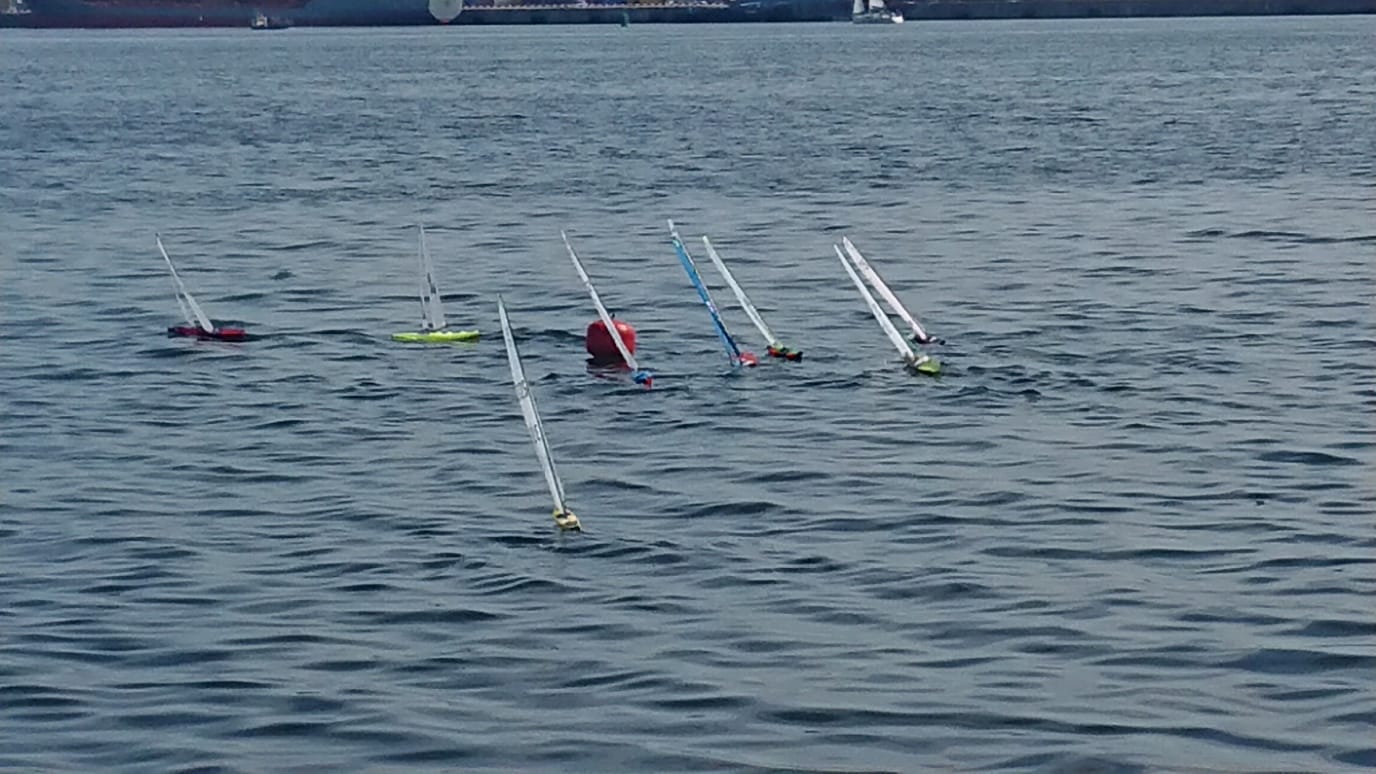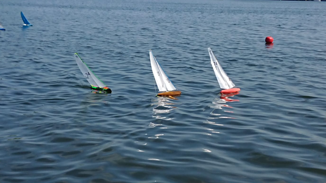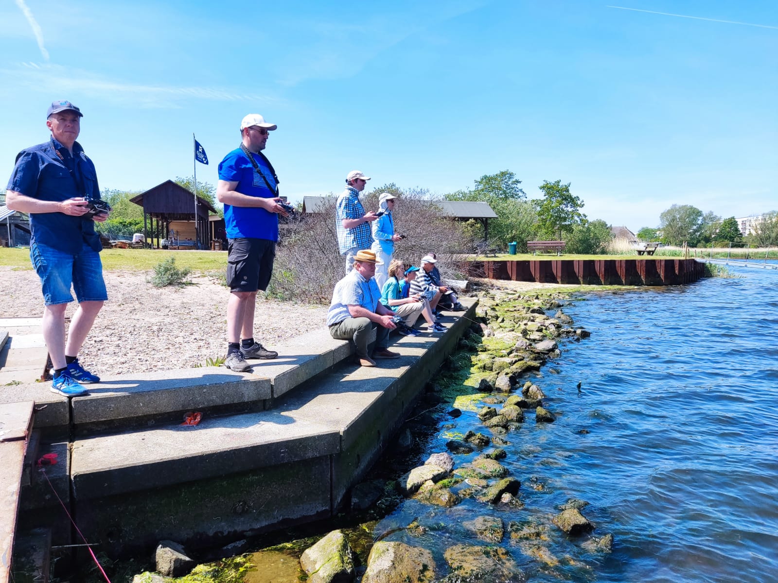 Samstag früh hatten sich 11 Segler auf den Weg gemacht. Neu dabei war Lutz aus Berlin. Gegen Mittag kam auch noch Arne’s jüngerer Bruder Christian hinzu, der ebenfalls mit dem Segel-Gen bestückt ist (Laufsieg in Rennen 14). Bei Sonne pur und endlich sommerlichen Temperaturen, Ostwind mit 5-12 kn sowie etwas Welle segelten wir 16 Rennen. Die Bedingungen waren etwas technischer zu fahren als Flachwasser-heizen im Hafenbecken. Sieben von zwölf Fahrern konnten Laufsiege verbuchen, sechs gingen an Patrick, vier an Torsten (GER-340). Sensationell und erwähnenswert fuhr Youngster Piet in Rennen zwei allen davon, musste jedoch die letzten Rennen mit technischem Defekt aussteigen. Defekte und Kollisionen hatten wir allerlei, aber des neue Mehrzweck RC Boot, designt zum Tonnenlegen und für Notrettungen, verrichtete brav seinen Dienst. Torsten (GER-75) wäre mit Sicherheit auch an der Spitze mitgesegelt, aber sein Akku in der Funke ging leider im dritten Lauf kaputt und er fungierte anschließend als Regattaleiter.