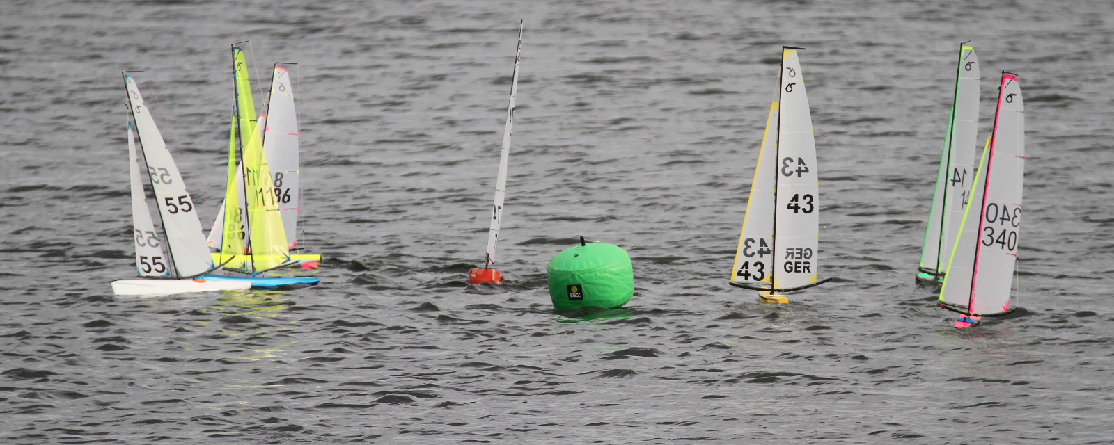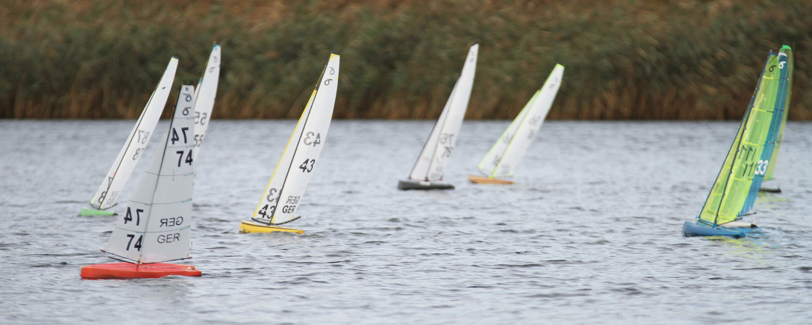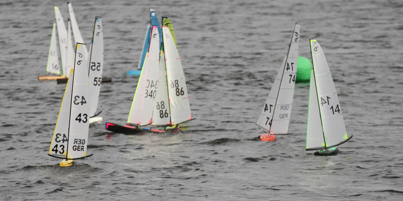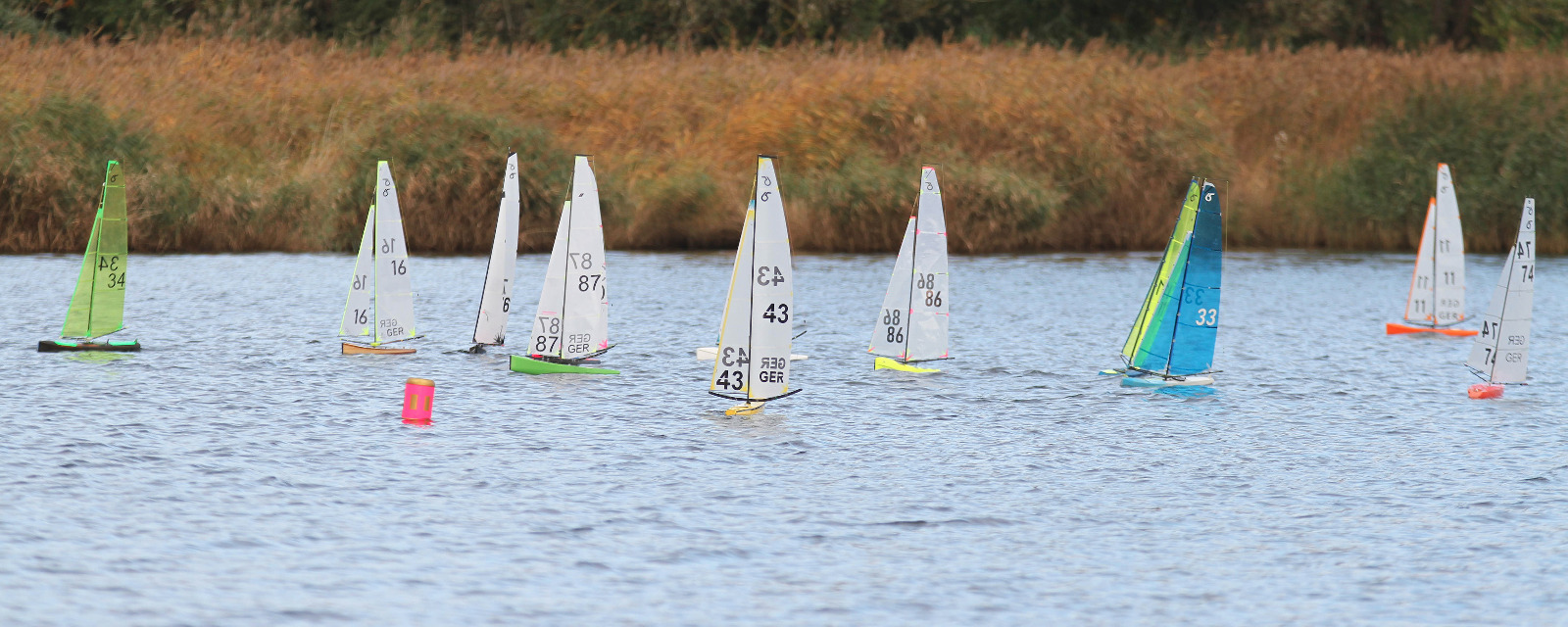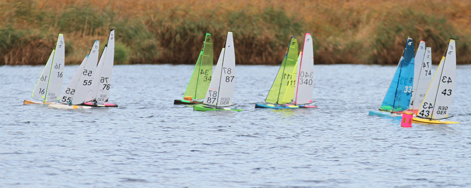Regattabericht: Deutsche Meisterschaft RC Segeln – Bootsklasse C65Vom 16.-17. Oktober 2021 fand für die Bootsklasse C65 die Deutsche Meisterschaft in RC Segeln im Rostocker Schifffahrtsmuseum statt. Im nördlichen Teil des Geländes befindet sich eine historische Bootswerft deren Steg und Holzbauhalle für die Regatta genutzt wurde. Die Unterwarnow hat dort eine kleine Einbuchtung nach Westen, so dass für westliche, nördliche, östliche bis südöstliche Windrichtungen gut Kurse ausgelegt werden können. Am Anreisetag blies es schrägauflandig mit über 20 kn, so dass C-Riggs bis teilweise D-Riggs im freien Training zum Einsatz kamen. Beim Segeln um die Bojen kamen Erinnerungen an die DM 2019 in Burhave auf, wo am ersten Wettkampftag ähnliche Starkwindbedingungen herrschten. Für die nachfolgenden Wettkampftage waren jedoch gemäßigte Bedingungen bis 18 kn aus West bis Westsüdwest gemeldet. Samstag morgen begann die Crew um Regattaleiter Wolf Weiss den Kurs auszulegen. Eine Kombination aus Schlauchboot und RC Tonnenleger kam zum Einsatz. So lagen ein paar Tonnen als Fixpunkte und der Startbereich sowie die Ablauftonne solten später leicht per Grundleine von Land aus korrigierbar sein. Es herrschten etwa 8-12 kn leicht schräg ablandig und die Luv- und Ablauftonne wurden weit in den Seitenarm hineingelegt. Die Startlinie wurde in Stegnähe platziert, jedoch sah man vom Ufer leicht schräg von Luv auf die Linie. Die Leetonne lag relativ weit entfernt, aber RC Segler haben ja sehr geschulte „Adleraugen“