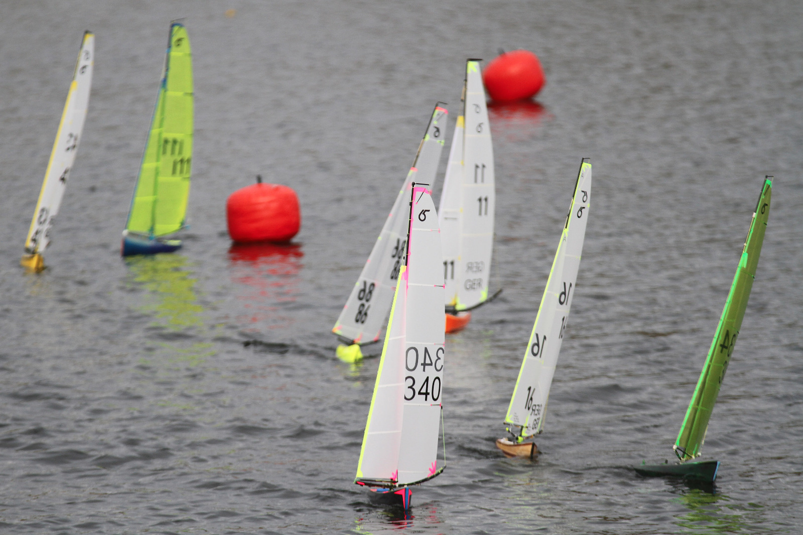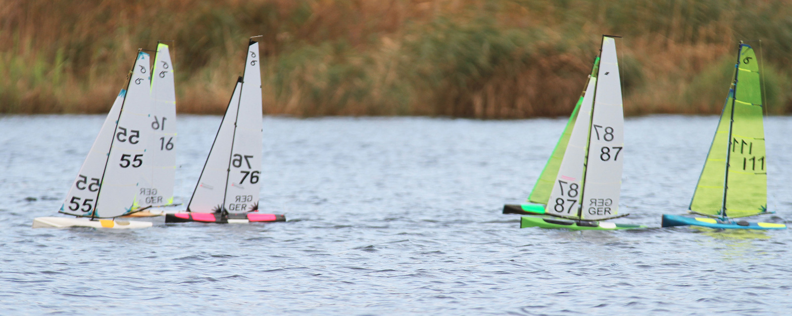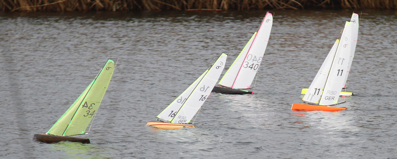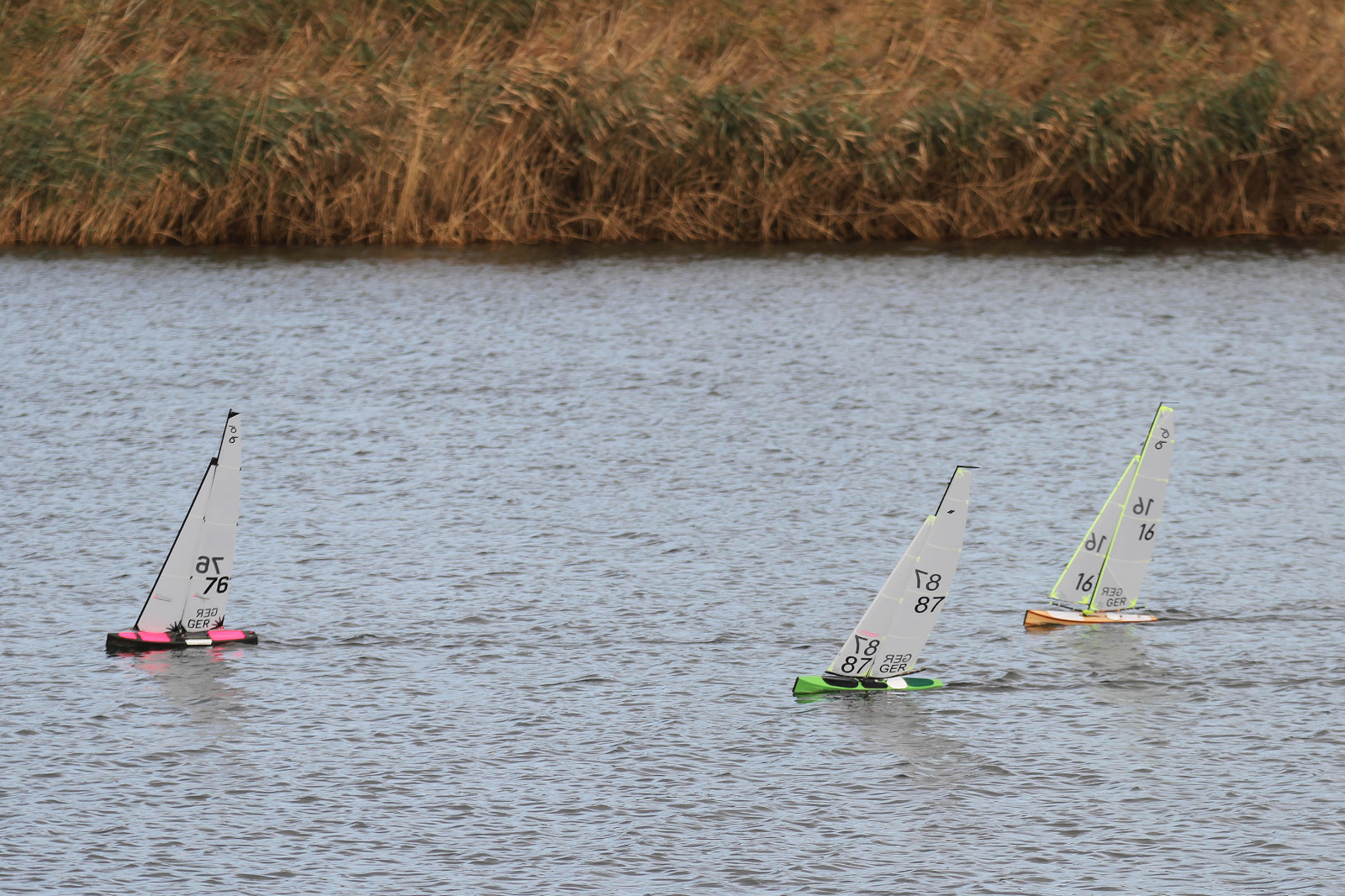 Regattabericht: Deutsche Meisterschaft RC Segeln – Bootsklasse C65Vom 16.-17. Oktober 2021 fand für die Bootsklasse C65 die Deutsche Meisterschaft in RC Segeln im Rostocker Schifffahrtsmuseum statt. Im nördlichen Teil des Geländes befindet sich eine historische Bootswerft deren Steg und Holzbauhalle für die Regatta genutzt wurde. Die Unterwarnow hat dort eine kleine Einbuchtung nach Westen, so dass für westliche, nördliche, östliche bis südöstliche Windrichtungen gut Kurse ausgelegt werden können. Am Anreisetag blies es schrägauflandig mit über 20 kn, so dass C-Riggs bis teilweise D-Riggs im freien Training zum Einsatz kamen. Beim Segeln um die Bojen kamen Erinnerungen an die DM 2019 in Burhave auf, wo am ersten Wettkampftag ähnliche Starkwindbedingungen herrschten. Für die nachfolgenden Wettkampftage waren jedoch gemäßigte Bedingungen bis 18 kn aus West bis Westsüdwest gemeldet. Samstag morgen begann die Crew um Regattaleiter Wolf Weiss den Kurs auszulegen. Eine Kombination aus Schlauchboot und RC Tonnenleger kam zum Einsatz. So lagen ein paar Tonnen als Fixpunkte und der Startbereich sowie die Ablauftonne solten später leicht per Grundleine von Land aus korrigierbar sein. Es herrschten etwa 8-12 kn leicht schräg ablandig und die Luv- und Ablauftonne wurden weit in den Seitenarm hineingelegt. Die Startlinie wurde in Stegnähe platziert, jedoch sah man vom Ufer leicht schräg von Luv auf die Linie. Die Leetonne lag relativ weit entfernt, aber RC Segler haben ja sehr geschulte „Adleraugen“