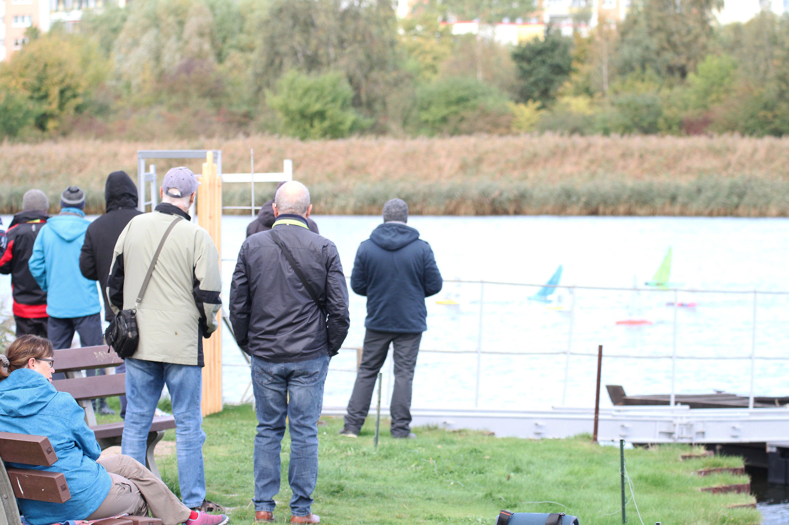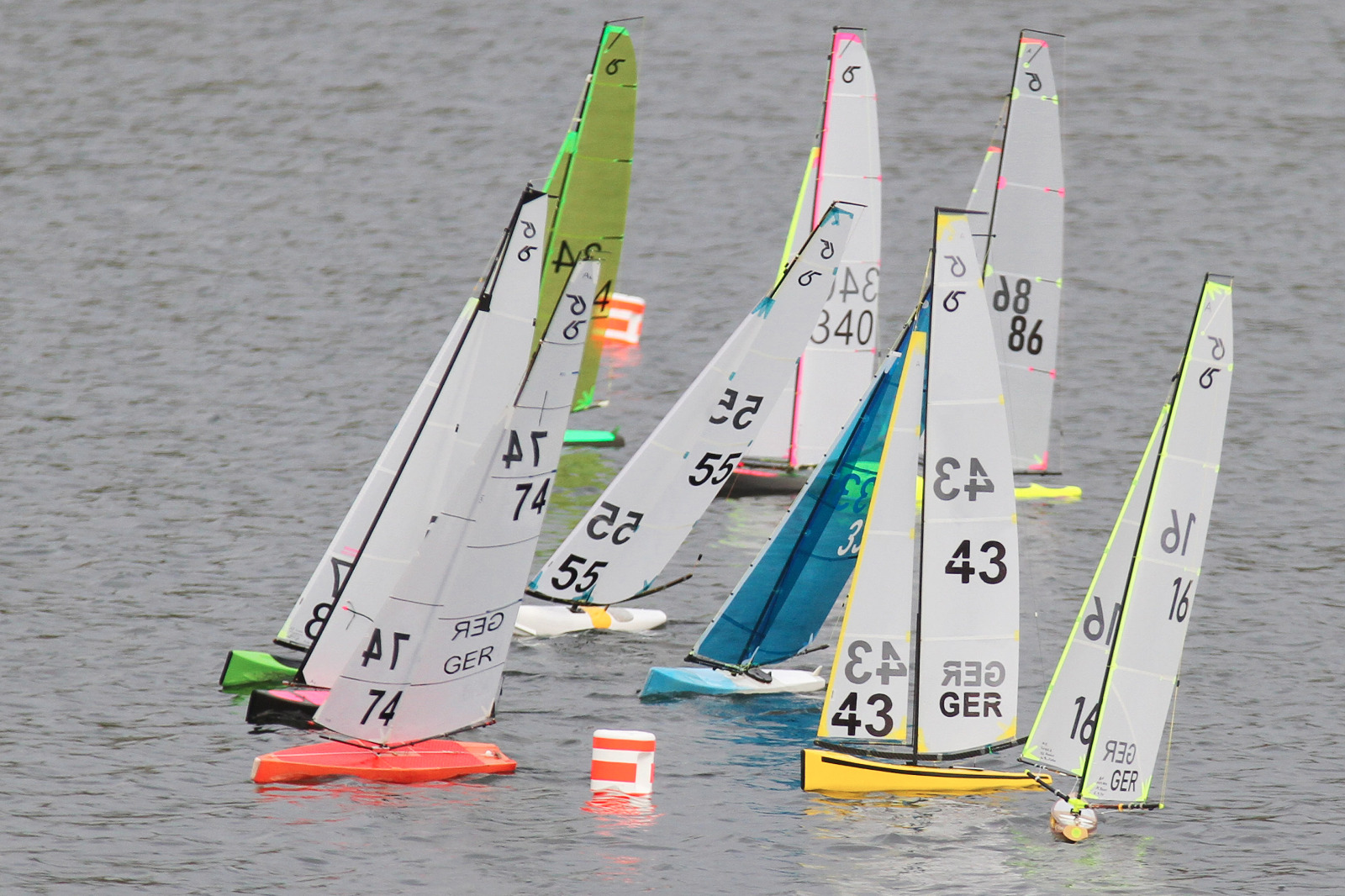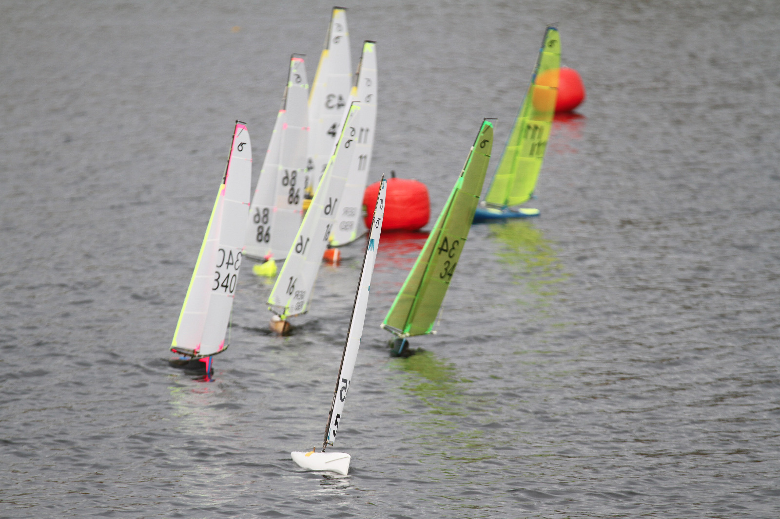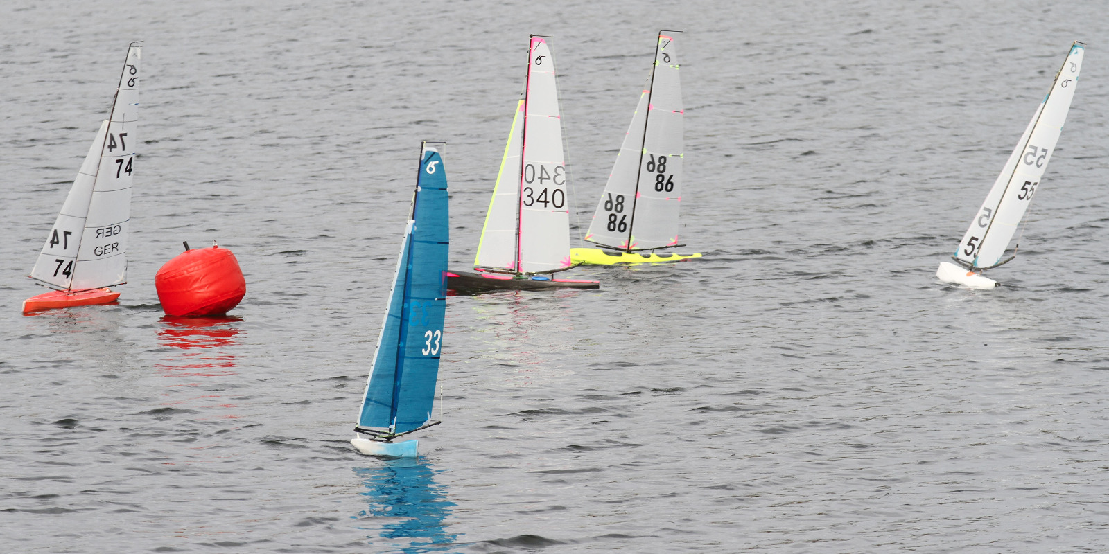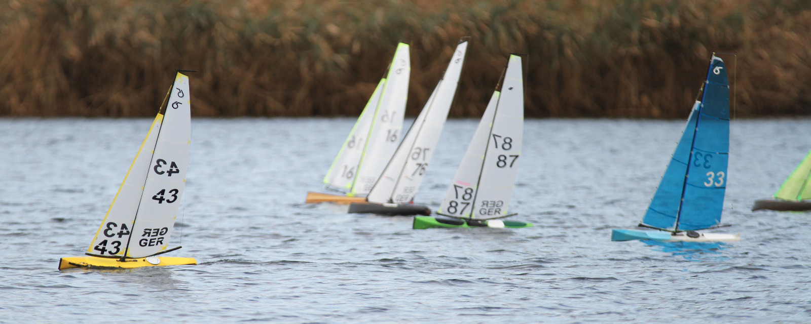 Regattabericht: Deutsche Meisterschaft RC Segeln – Bootsklasse C65Vom 16.-17. Oktober 2021 fand für die Bootsklasse C65 die Deutsche Meisterschaft in RC Segeln im Rostocker Schifffahrtsmuseum statt. Im nördlichen Teil des Geländes befindet sich eine historische Bootswerft deren Steg und Holzbauhalle für die Regatta genutzt wurde. Die Unterwarnow hat dort eine kleine Einbuchtung nach Westen, so dass für westliche, nördliche, östliche bis südöstliche Windrichtungen gut Kurse ausgelegt werden können. Am Anreisetag blies es schrägauflandig mit über 20 kn, so dass C-Riggs bis teilweise D-Riggs im freien Training zum Einsatz kamen. Beim Segeln um die Bojen kamen Erinnerungen an die DM 2019 in Burhave auf, wo am ersten Wettkampftag ähnliche Starkwindbedingungen herrschten. Für die nachfolgenden Wettkampftage waren jedoch gemäßigte Bedingungen bis 18 kn aus West bis Westsüdwest gemeldet. Samstag morgen begann die Crew um Regattaleiter Wolf Weiss den Kurs auszulegen. Eine Kombination aus Schlauchboot und RC Tonnenleger kam zum Einsatz. So lagen ein paar Tonnen als Fixpunkte und der Startbereich sowie die Ablauftonne solten später leicht per Grundleine von Land aus korrigierbar sein. Es herrschten etwa 8-12 kn leicht schräg ablandig und die Luv- und Ablauftonne wurden weit in den Seitenarm hineingelegt. Die Startlinie wurde in Stegnähe platziert, jedoch sah man vom Ufer leicht schräg von Luv auf die Linie. Die Leetonne lag relativ weit entfernt, aber RC Segler haben ja sehr geschulte „Adleraugen“