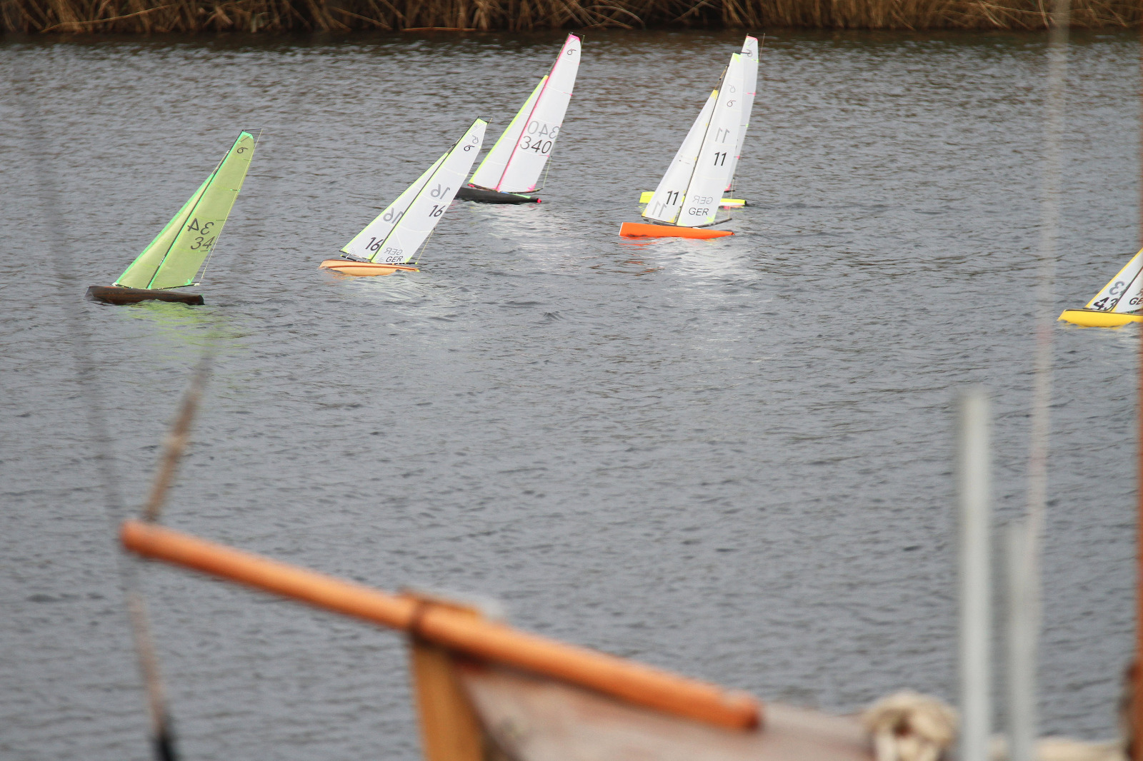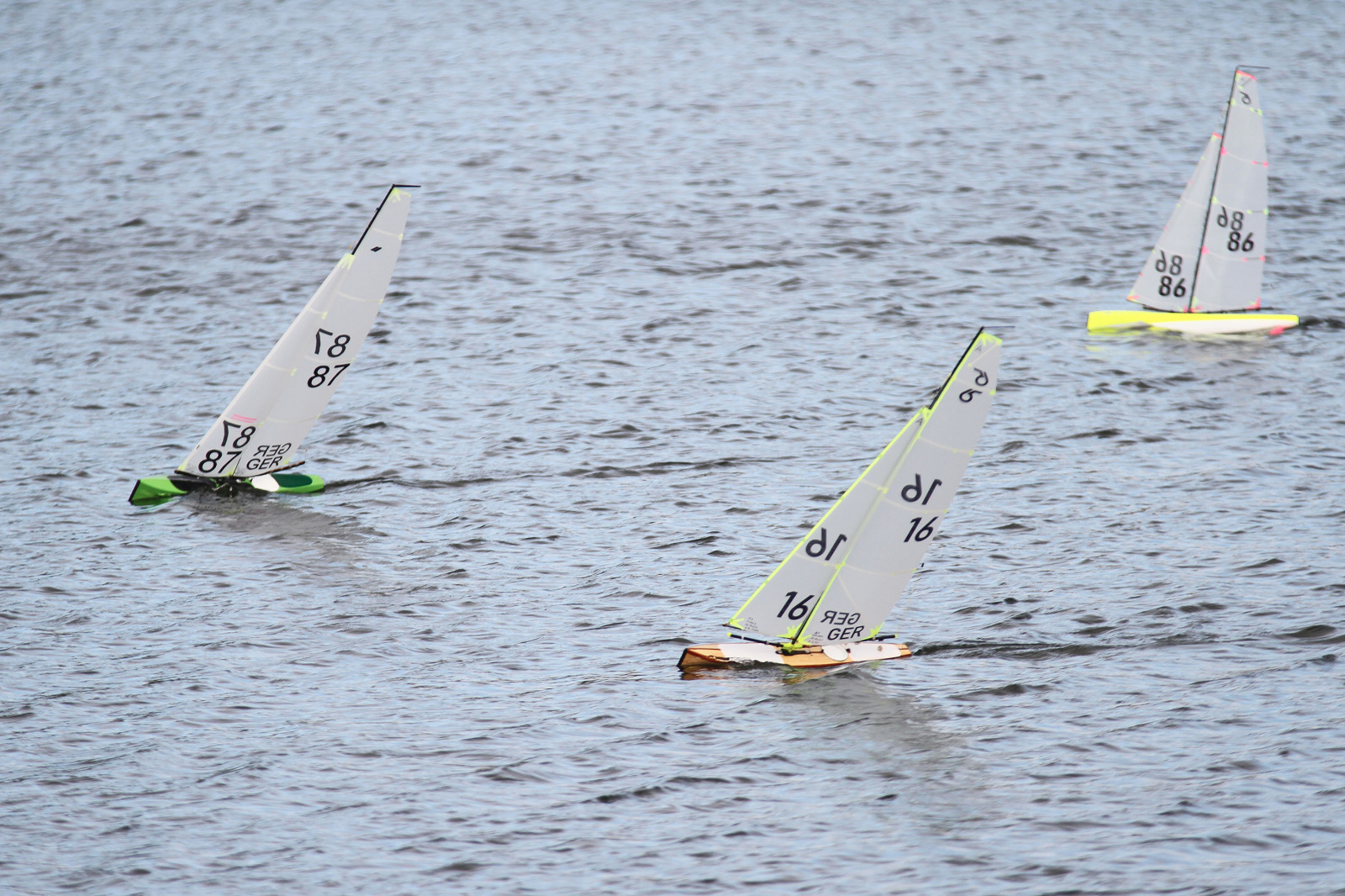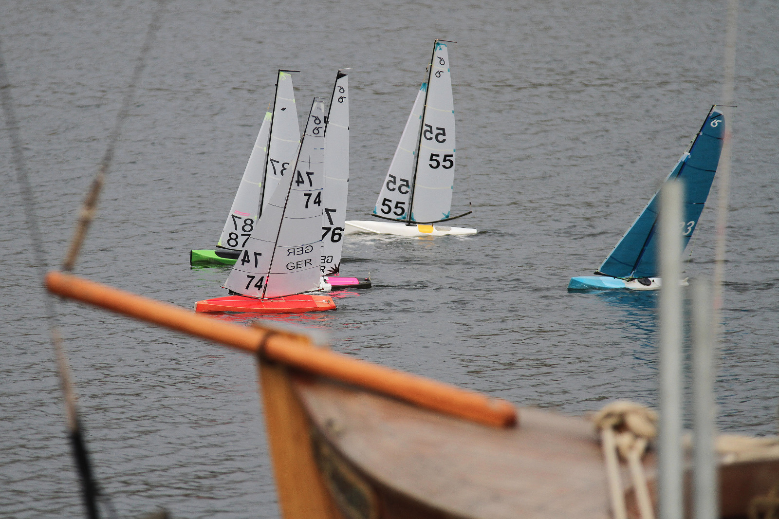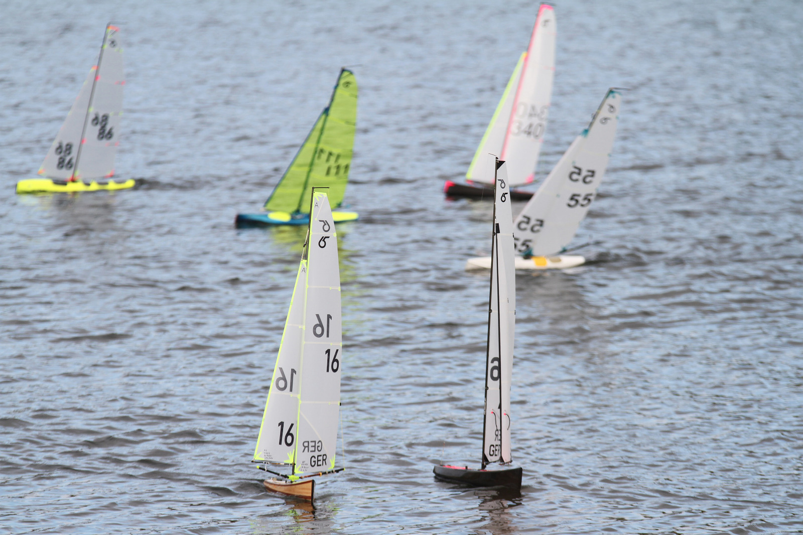 Regattabericht: Deutsche Meisterschaft RC Segeln – Bootsklasse C65Vom 16.-17. Oktober 2021 fand für die Bootsklasse C65 die Deutsche Meisterschaft in RC Segeln im Rostocker Schifffahrtsmuseum statt. Im nördlichen Teil des Geländes befindet sich eine historische Bootswerft deren Steg und Holzbauhalle für die Regatta genutzt wurde. Die Unterwarnow hat dort eine kleine Einbuchtung nach Westen, so dass für westliche, nördliche, östliche bis südöstliche Windrichtungen gut Kurse ausgelegt werden können. Am Anreisetag blies es schrägauflandig mit über 20 kn, so dass C-Riggs bis teilweise D-Riggs im freien Training zum Einsatz kamen. Beim Segeln um die Bojen kamen Erinnerungen an die DM 2019 in Burhave auf, wo am ersten Wettkampftag ähnliche Starkwindbedingungen herrschten. Für die nachfolgenden Wettkampftage waren jedoch gemäßigte Bedingungen bis 18 kn aus West bis Westsüdwest gemeldet. Samstag morgen begann die Crew um Regattaleiter Wolf Weiss den Kurs auszulegen. Eine Kombination aus Schlauchboot und RC Tonnenleger kam zum Einsatz. So lagen ein paar Tonnen als Fixpunkte und der Startbereich sowie die Ablauftonne solten später leicht per Grundleine von Land aus korrigierbar sein. Es herrschten etwa 8-12 kn leicht schräg ablandig und die Luv- und Ablauftonne wurden weit in den Seitenarm hineingelegt. Die Startlinie wurde in Stegnähe platziert, jedoch sah man vom Ufer leicht schräg von Luv auf die Linie. Die Leetonne lag relativ weit entfernt, aber RC Segler haben ja sehr geschulte „Adleraugen“