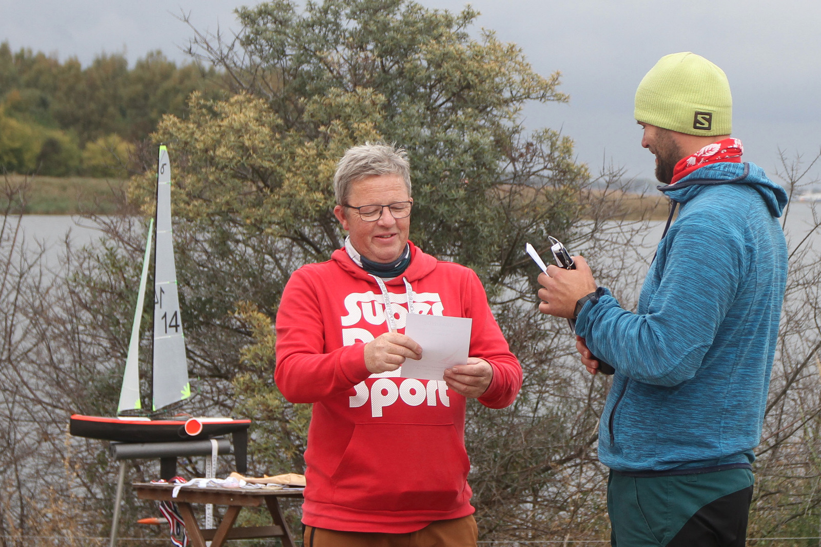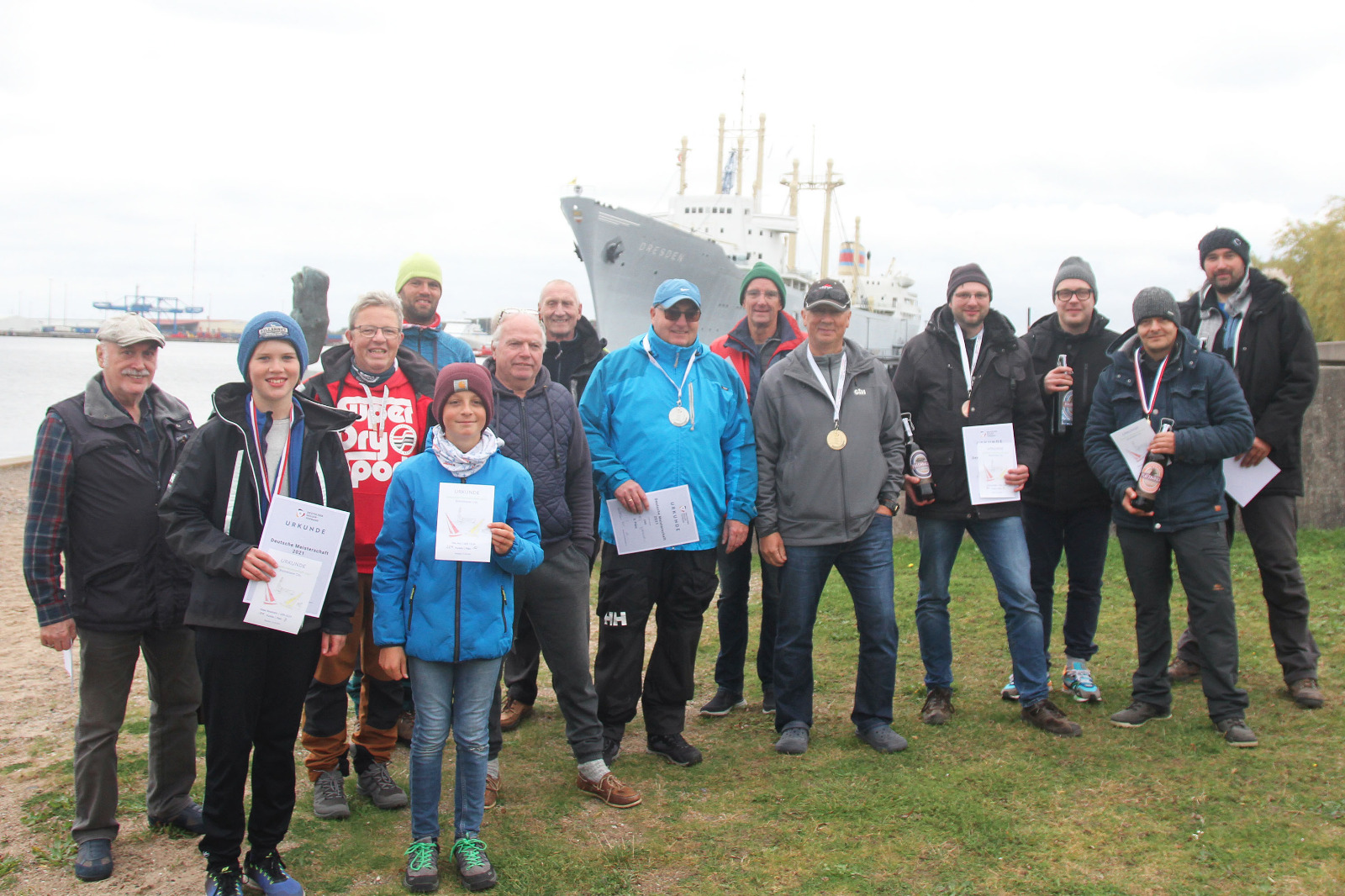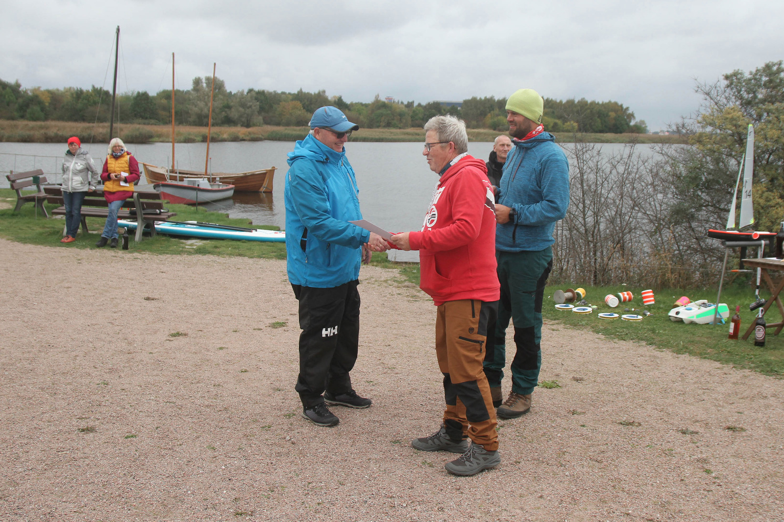 . Klasssenreferent Thomas Edom führte parallel die Anmeldung und Materialregistrierung durch. Nach kurzem „Skippersmeeting“ wurde pünktlich 10:30 Uhr gestartet und bis zur Mittagspause konnten 7 Läufe in oberen A-Rigg Bedingungen gesegelt werden. Der Topfavorit und amtierende Meister Torsten Fildebrandt (GER 87) startete im Auftaktrennen mit einem dritten Platz in die Regatta, während Norbert Heinz (GER 16) und Manfred Brändle (GER 76) sich vor ihm platzieren konnten. Patrick Schiller (GER 86) saß dem Trio auf den Fersen. Rennen zwei ging an Manfred Brändle, doch ab Rennen 3 war Torsten „warm“ gefahren und legte bis zum Mittag 4 Laufsiege in Folge nach. Auch am Nachmittag setzte er die Serie fort und abends standen nach 18 Läufen 14 Laufsiege für ihn auf dem Zettel. Es folgten Norbert Heinz mit 40 Punkten sowie Patrick Schiller und Manfred Brändle mit je 53 Punkten. In der Tageswertung komplettierte Newcomer und Regionalfahrer Alexander (111) Oswald aus Neubrandenburg die „Top Five“, gefolgt von Torsten Wackrow (GER 340) und Jugendfahrer Klaas Naumann (GER 33).Am Abend traf man sich im Stadthafen Rostock zum „Skippers Dinner“ im Restaurant CarLo 615, einer von Rostock’s guten Adressen von denen wir auch die Mittagsversorgung geliefert bekamen. Am Wettkampftag zwei fiel 09:45 Uhr der erste „Startschuss“. Der Wind wehte etwas leichter (mittlere bis leichte A Rigg Bedingungen) aber nahezu Uferparallel und versprach nahezu ideale Segelbedingungen. Diesmal konnte die Startlinie direkt vom Ufer gepeilt werden und es folgten weitere 10 spannende Rennen. Bis auf zwei Rennen mit einem „Ausreißer“ (Platz 5) setzte Torsten seine Serie an Laufsiegen fort. Patrick Schiller konnte diese zwei Rennen für sich verbuchen und fuhr einen souveränen zweiten Regattatag. Hervorzuheben ist Nachwuchsfahrer Klaas Naumann. Der erst 12 jährige Lokalfahrer aus Warnemünde lag in zwei Rennen bis zur Zielgeraden auf Platz eins, wurde aber jeweils von Torsten und Patrick noch abgefangen und auf Platz zwei verwiesen. Im finalen Klassement siegte Torsten Fildebrandt mit nur 26 Punkten in 28 Rennen und zeigte erneut seine taktischen Fähigkeiten. Das Podium wurde von Norbert Heinz (66 Punkte) und Patrick Schiller (82 Punkte) komplettiert. Bester „Rookie“ wurde Alexander Oswald auf Platz 5 (137 Punkte) und Klaas Naumann sicherte sich die Jugendwertung (Platz 7, 154 Punkte). So ging eine schöne Meisterschaft 2021 in trockenem aber windigem Herbstwetter zu Ende. Als Andenken gab es für die Erwachsenen Teilnehmer zur Siegerehrung besondere Biere der Rostocker Brauerei Trotzenburg mit so spannenden Namen wie „Platzhirsch“, „Frechdachs“, „Wildsau“ und „Schluckspecht“. Der Klassenreferent hatte sichtliche Freude daran, die jeweilige Sorte nach seinen langjährigen Erfahrungen für die Teilnehmer auszuwählen. Ein kleiner Spass neben ernstem aber fairem Wettbewerb auf dem Wasser darf ja auch nicht fehlen. ;-)Herzlichen Dank richte ich an Wolf Weiss für die souveräne Regattaleitung, meinem Vater als „Zielschiff“ sowie an die Unterstützung des Schifffahrtsmuseums und Catering von CarLo 615. Euer Michael