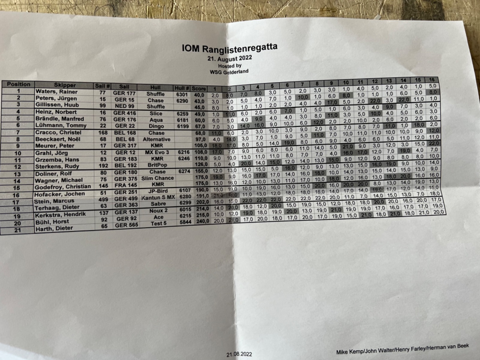 Yogi legte - offensichtlich besonders gut gestärkt - mit vollem Elan vor und segelte drei erste Plätze in Folge. Für mich lief es auf einen Gesamtsieg von Yogi hinaus, der höchstens noch von Huub gefährdet werden könnte. Das war zumindest mein subjektiver Eindruck. Ich hatte mir keine Zwischenergebnisse angeschaut, weil mich das meistens nur vom Geschehen ablenkt.