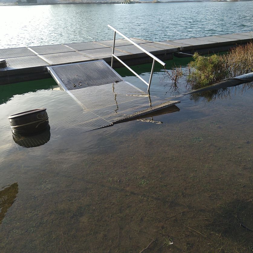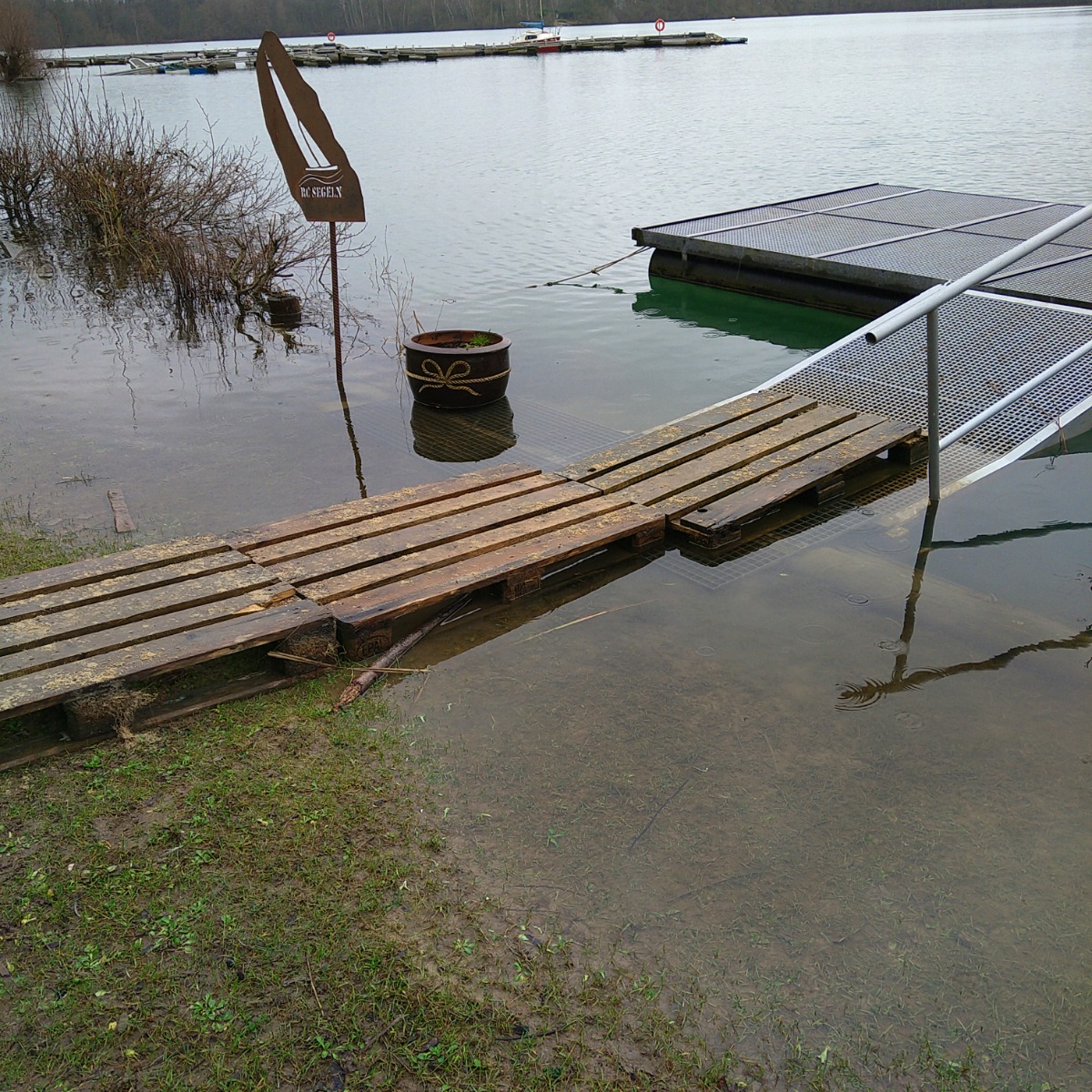 Der Parkplatz ist nicht befahrbar, geschweige denn benutzbar. Auf unseren Steg kommt man nur über Holzpaletten die sehr rutschig sind , so das dass nicht verantwortbar ist.