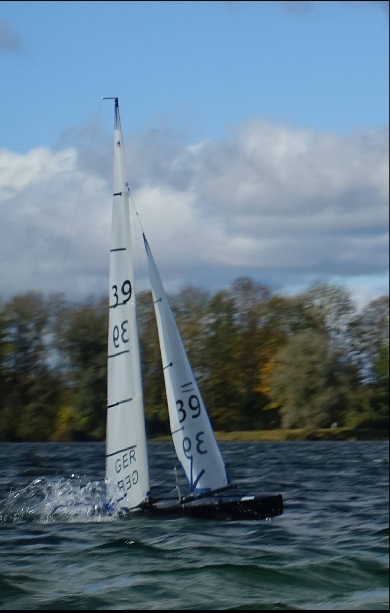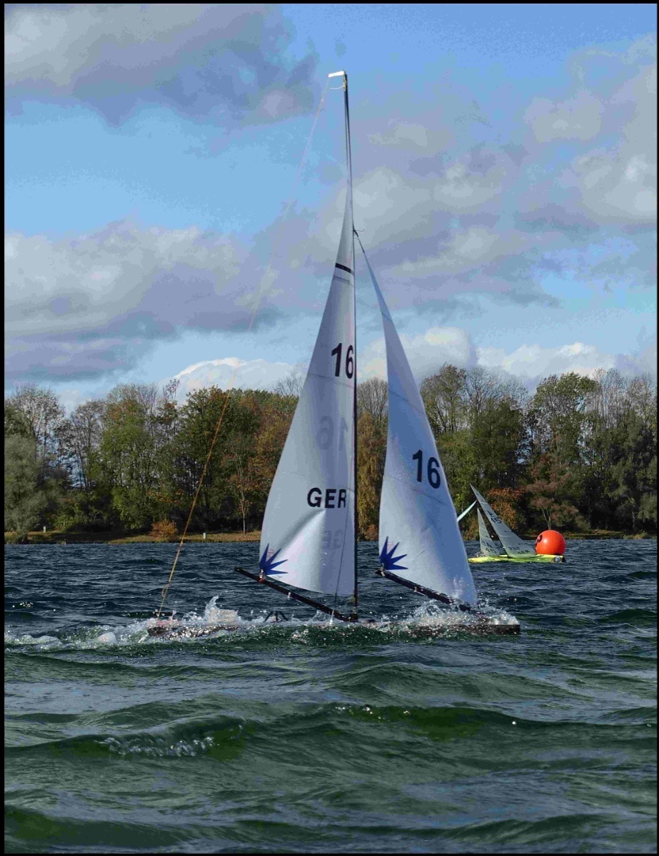 Wie ihr dem Ergebnis entnehmen könnt, siegte Gerhard Schmitt sehr souverän. Nach Jahren des Tüftelns an seiner JethRail hatte er einen neuen Mastkoker an veränderter Position eingebaut – und endlich zeigte das Boot seine Leistungsfähigkeit bei starkem Wind. Böen setzte es nun selbstständig in Speed und kontrolliertes Anluven um, ohne dabei zu überziehen.