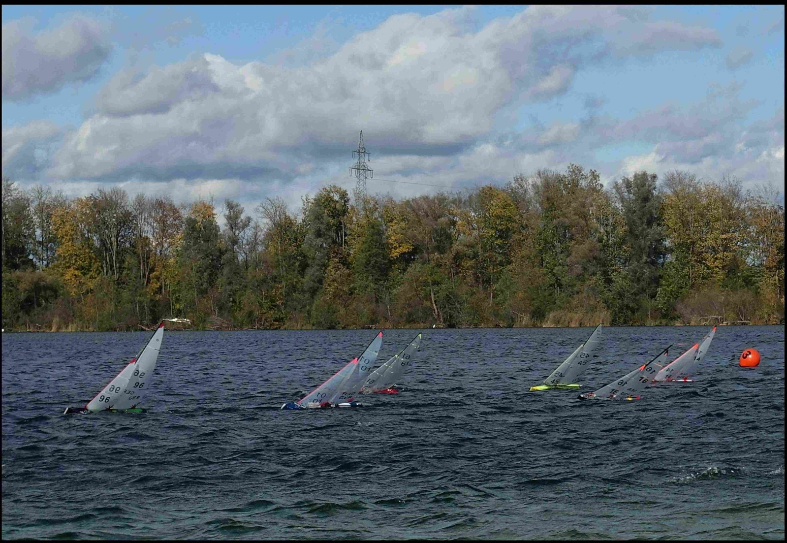 Der erste Lauf am Samstag konnte noch mit A-Rigg gesegelt werden, doch dann nahm der Wind rasch zu. Trotz der starken Böen gab es immer wieder größere Windlöcher, die das Feld ordentlich durcheinanderwirbelten. Insgesamt wurde sehr fair gesegelt, und es kam zu keinen nennenswerten Schäden durch Kontakte. Nach dem zehnten Lauf wurde das Segeln am Samstagabend bei strömendem Regen und kräftigen Böen in gegenseitigem Einvernehmen etwas vorzeitig beendet – zu diesem Zeitpunkt waren ohnehin nur noch vier Boote einsatzfähig.