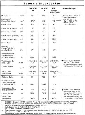 Zurück zur nicht notwendigen Ehrfurcht. Das Ergebnis war, daß der Lateraldruckpunkt der neuen Flosse trotz allem Maßnehmen um Ca. 1 cm weiter vorn lag. Also die ganze Arbeit noch einmal? Bevor ich startete, machte ich mich (endlich) daran, doch einmal genauer zu rechnen und wie zuvor empfohlen, A L L E Druckpunkte genauer zu bestimmen. um zu wissen, wo ich tatsächlich liege. Für mein 10R-Boot wollte ich dies auch wissen und nahm die Berechnungen auch mit auf. Herausgekommen ist die nachstehende Tabelle. die ich zum Studium freigebe. Hieizu noch einige Erklärungen zu den einzelnen Punkten:
